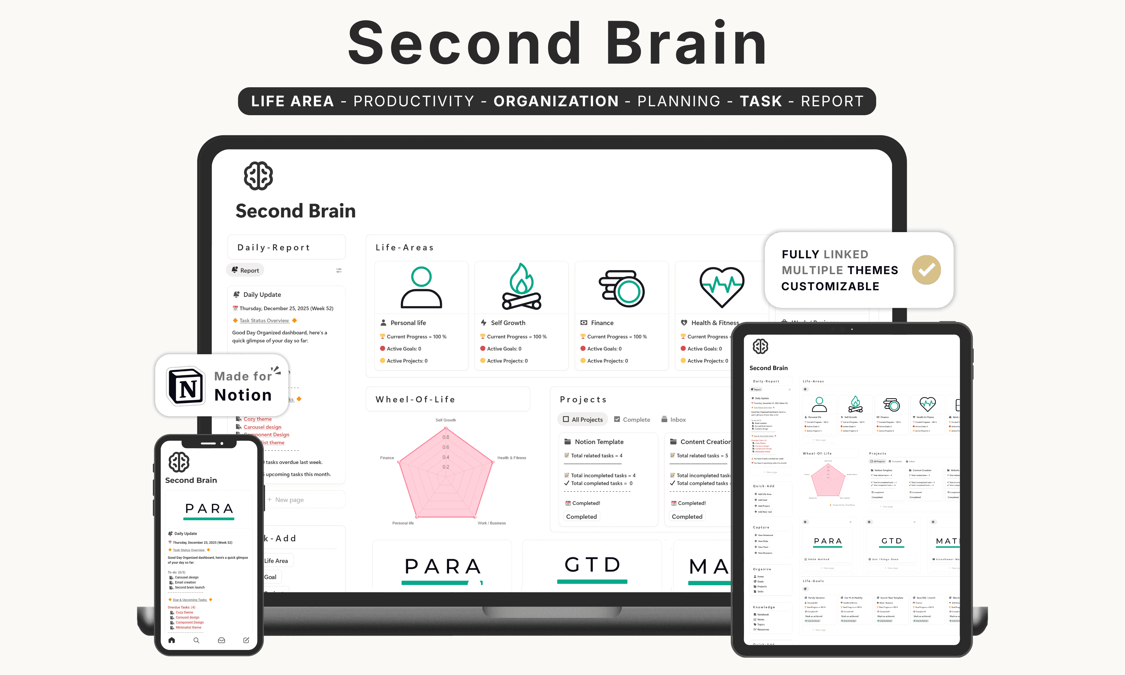 The Second Brain brings everything into one fully-linked Notion system - built around PARA, GTD, and Eisenhower so you have a proven framework, not a blank page to figure out yourself.