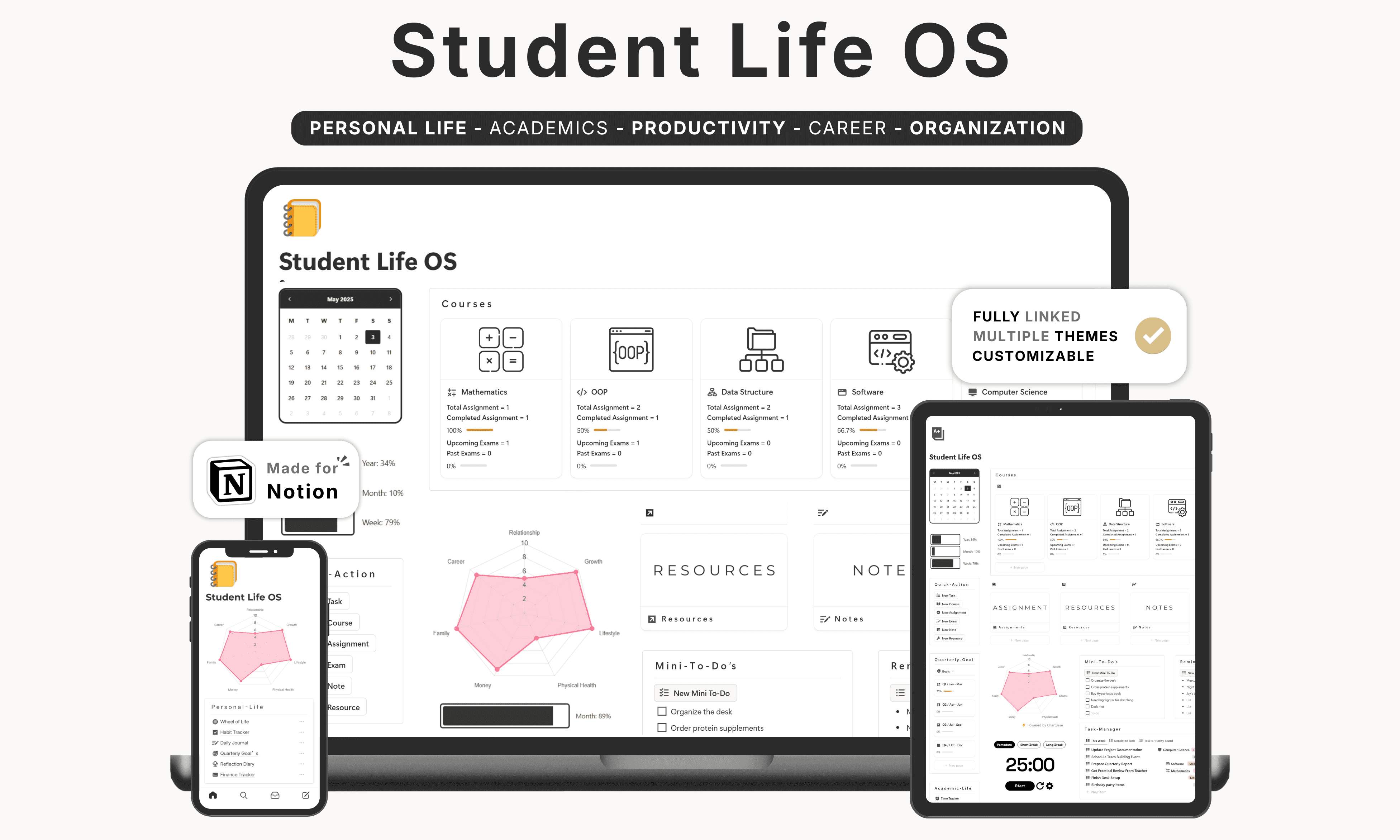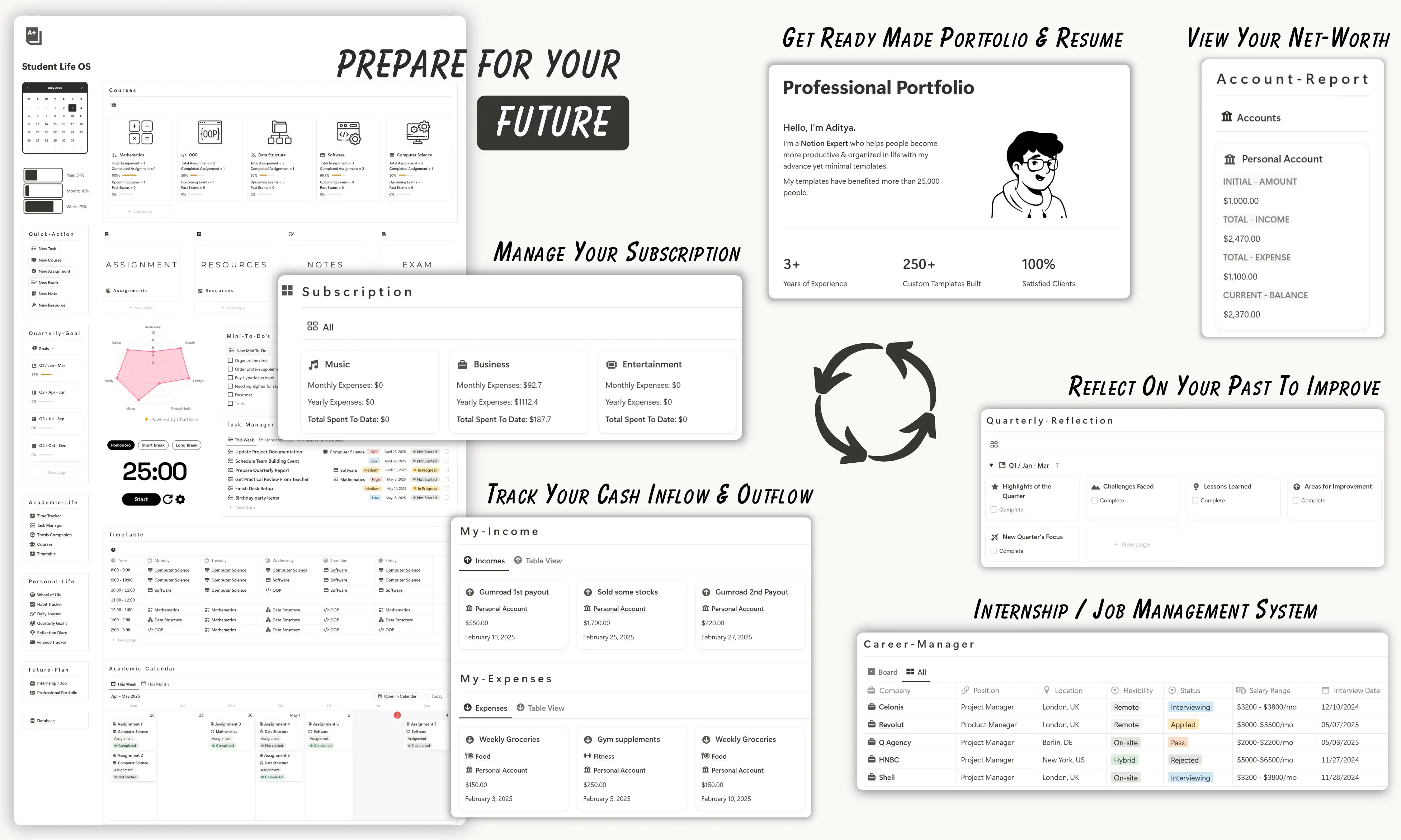 Most student planners track your courses. Student Life OS manages your entire student life — academics, personal growth, and career planning in one fully-linked Notion system.
